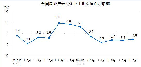 1-7月份,房地產開發企業土地購置面積17824萬平方米,同比下降4.8%,降幅比1-6月份收窄1個百分點;土地成交價款4828億元,增長9.8%,增速提高0.8個百分點。