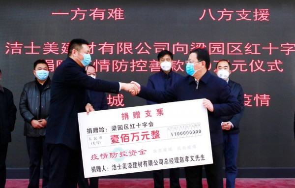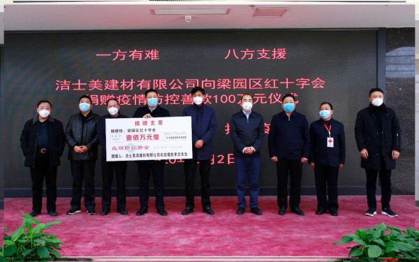 2月2日,上海潔士美建材有限公司董事長趙孝文先生向河南省商丘市梁園區紅十字會捐助100萬元人民幣(款項已到帳),出席捐款儀式的領導有梁園區委書記薛鳳林、梁園區人民政府區長張兵、副區長陳斌、何玉東等各級領導。