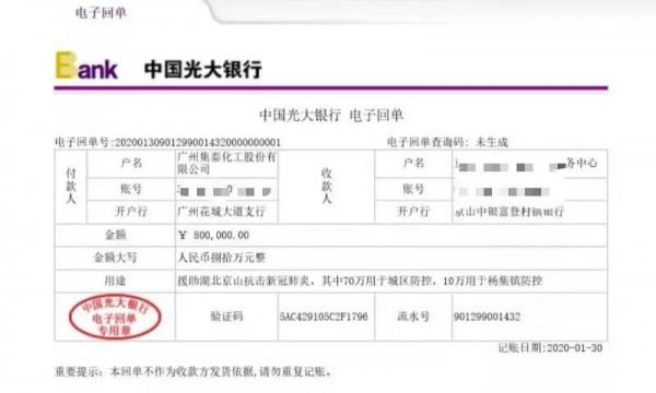 生命重于泰山,疫情十萬火急。截至1月28日,廣州集泰化工股份有限公司通過各種途徑緊急采購價值20余萬元的9萬只醫用口罩,發往京山市紅十字會,緊急馳援湖北抗擊疫情。并于今日捐贈現金80萬元。