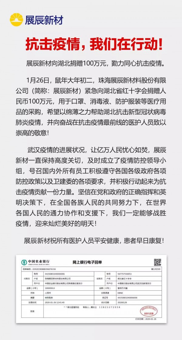 1月26日,鼠年大年初二,珠海展辰新材料股份有限公司(簡稱:展辰新材)緊急向湖北省紅十字會捐贈人民幣100萬元,用于口罩、消毒液、防護(hù)服裝等醫(yī)療用品的采購,希望以綿薄之力幫助湖北抗擊新型冠狀病毒肺炎疫情,并向奮戰(zhàn)在抗擊疫情最前線的醫(yī)護(hù)人員致以崇高的敬意!