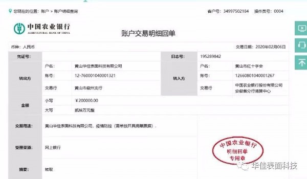 2020年2月6日,華佳表面科技通過黃山市紅十字會捐贈20萬元,將專項用于抗擊新型冠狀病毒感染肺炎疫情防控工作,助力打贏疫情防控阻擊戰。