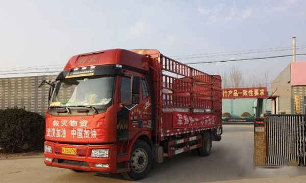 裝車地點離該公司廠區正門不足百米。記者看到,停靠在生產車間旁的這輛冀J牌照紅色貨車,車頭擋風玻璃正下方和貨廂的一側分別懸掛著“救災物資武漢加油中國加油”“軍輝防火心系疫區”紅色條幅,防火涂料已快裝滿了整個車廂。