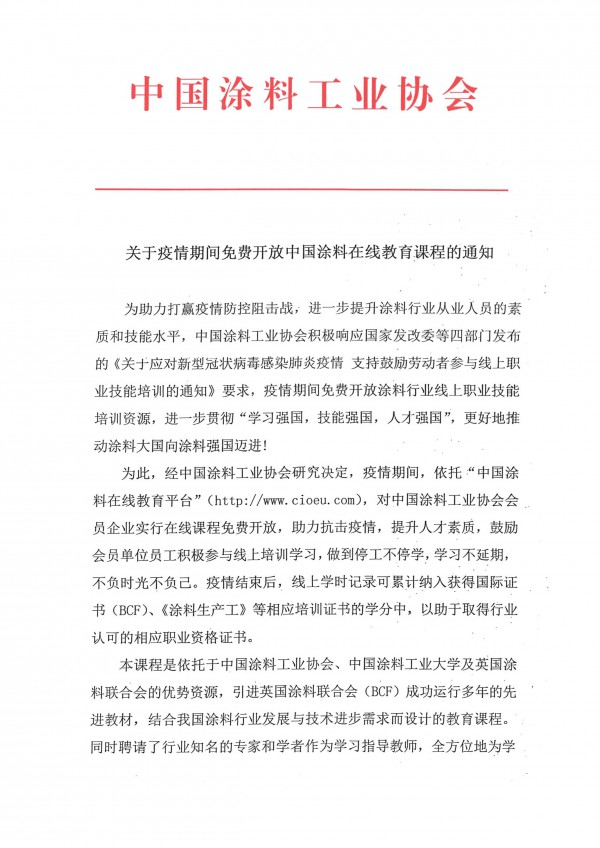 為此,經(jīng)中國涂料工業(yè)協(xié)會研究決定,疫情期間,依托“中國涂料在線教育平臺”(http://www.cioeu.com),對中國涂料工業(yè)協(xié)會會員企業(yè)實行在線課程免費開放,助力抗擊疫情,提升人才素質(zhì),鼓勵會員單位員工積極參與線上培訓(xùn)學(xué)習(xí),做到停工不停學(xué),學(xué)習(xí)不延期,不負時光不負己。疫情結(jié)束后,線上學(xué)時記錄可累計納入獲得國際證書(BCF)、《涂料生產(chǎn)工》等相應(yīng)培訓(xùn)證書的學(xué)分中,以助于取得行業(yè)認可的相應(yīng)職業(yè)資格證書。