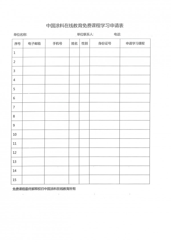 中國涂料在線教育免費課程學(xué)習(xí)申請表