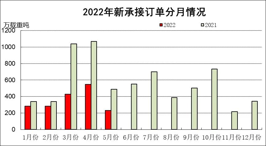 1~5月,50家重點(diǎn)監(jiān)測(cè)造船企業(yè)造船完工1375萬載重噸,同比下降17.6%。承接新船訂單1650萬載重噸,同比下降48.4%。5月底,手持船舶訂單9899萬載重噸,同比增長(zhǎng)19.4%。
