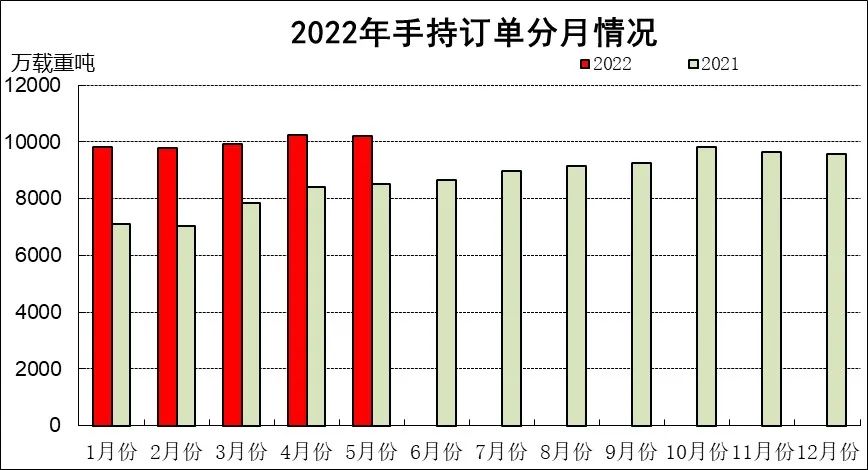 1~5月,全國(guó)造船完工量441萬修正總噸,同比增長(zhǎng)1.8%;新承接船舶訂單量903萬修正總噸,同比下降23.7%。截至5月底,手持船舶訂單量4172萬修正總噸,同比增長(zhǎng)30.6%。
