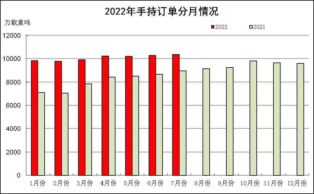 全國(guó)完工出口船1795萬(wàn)載重噸,同比下降20.8%;承接出口船訂單2359萬(wàn)載重噸,同比下降41.5%;7月末手持出口船訂單9215萬(wàn)載重噸,同比增長(zhǎng)16.4%。出口船舶分別占全國(guó)造船完工量、新接訂單量、手持訂單量的86.1%、91.7%和88.9%。