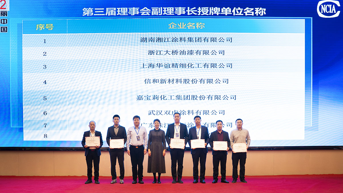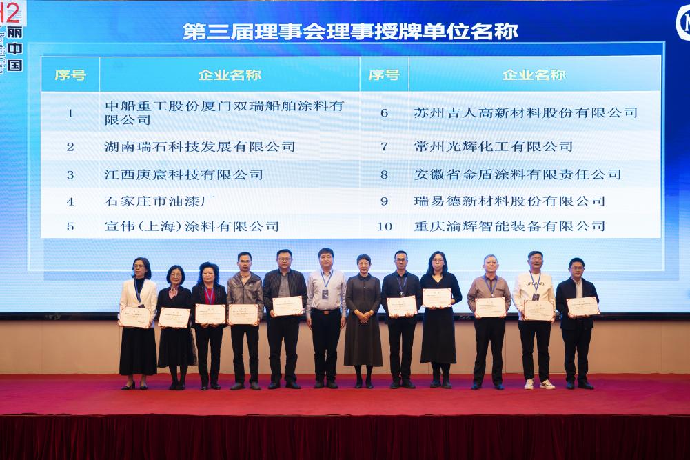 中國涂料工業(yè)協(xié)會孫蓮英會長首先為第三屆理事會理事長單位海洋化工研究院有限公司、第三屆理事會理事長王波頒發(fā)證書,緊接著,由孫蓮英會長與王波理事長為到場的各副理事長單位、理事單位分別頒發(fā)證書。孫蓮英會長表示,希望第三屆理事會能帶領(lǐng)中國防腐涂料企業(yè)在綠色、高質(zhì)量發(fā)展道路上再上新臺階。