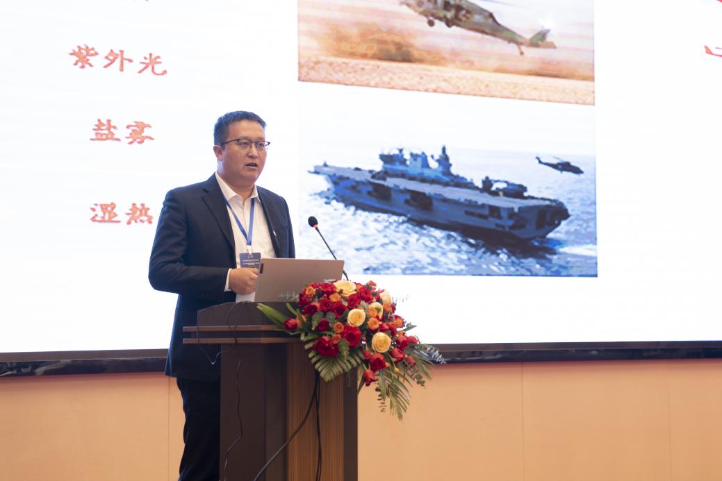 中海油常州涂料化工研究院有限公司涂料與防護(hù)工程研究院主任周如東就“直升機(jī)旋翼用新型長效防護(hù)涂覆材料關(guān)鍵技術(shù)研究及應(yīng)用”做主題報(bào)告,首先就直升機(jī)工作環(huán)境闡述了作戰(zhàn)環(huán)境破壞因素,要求直升機(jī)旋翼材料力學(xué)、機(jī)械性能優(yōu)異,因此,面對復(fù)雜作戰(zhàn)環(huán)境,新型長效防護(hù)涂覆材料關(guān)鍵技術(shù)影響巨大,常州院主要研究了聚脲彈性體功能性涂覆材料,根據(jù)Q/6S 《直升機(jī)旋翼槳葉防護(hù)材料抗砂蝕試驗(yàn)方法》檢測不同類型涂層性能差異,并分析了該類材料在其他領(lǐng)域的深層應(yīng)用,如機(jī)頭罩、雷達(dá)罩、軌道交通設(shè)備、打印機(jī)膠輥、石化煉化裝備等在耐雨蝕、冰雹、砂石沖刷、力學(xué)、化學(xué)穩(wěn)定性方面的優(yōu)異性能。