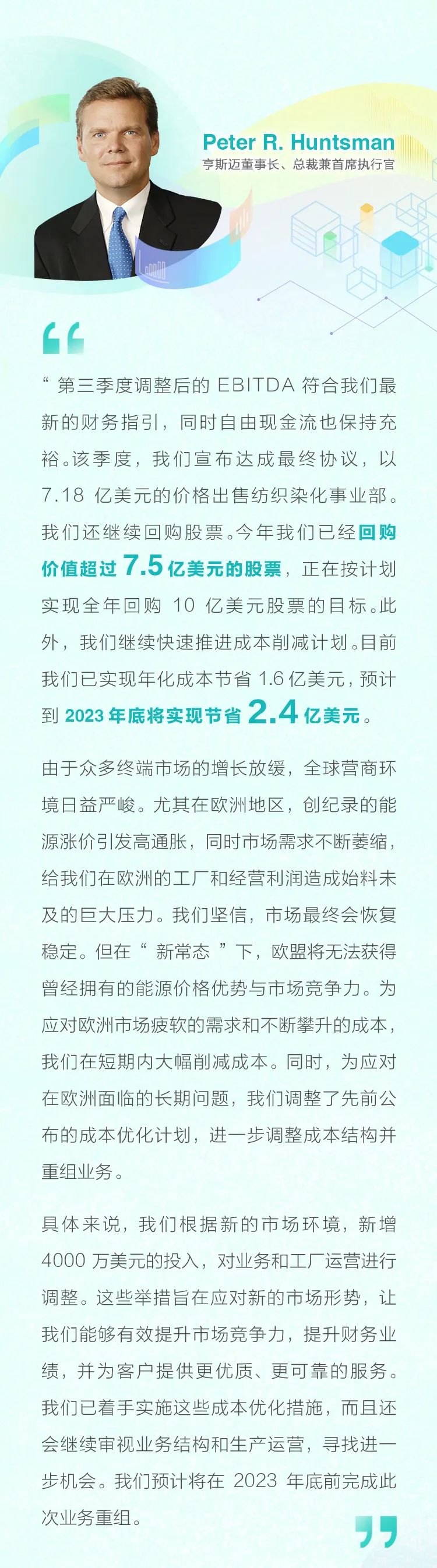 財報|亨斯邁前三季度回購超過7.5億美元股票