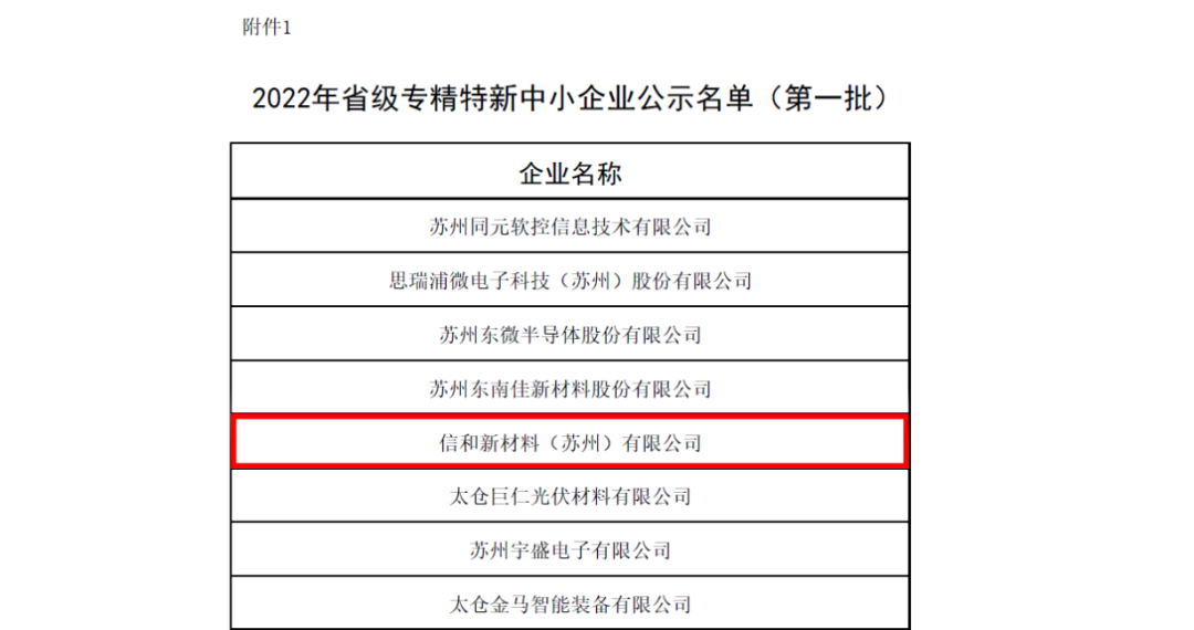 近日,江蘇省工信部公布江蘇省2022年專精特新中小企業和2019年度專精特新企業復核通過企業名單(第一批),信和新材料(蘇州)有限公司成功入選江蘇省工信廳批復的2022年度“專精特新”中小企業名單。