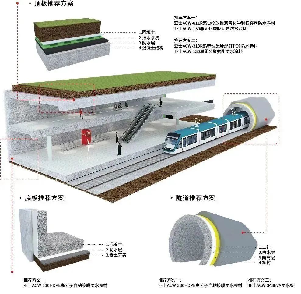 亞士防水針對不同結(jié)構(gòu)形式提供不同的系統(tǒng)解決方案,選擇易于施工、安全環(huán)保、符合氣候條件的防水材料,以混凝土結(jié)構(gòu)自防水為基礎(chǔ),以整體外包防水層為輔助,以變形縫、施工縫等接縫防水為處理重點,達成“剛?cè)嵯酀?、多道防線”的綜合治理體系,解決軌道交通工程在建設(shè)、運營各環(huán)節(jié)中存在的滲漏問題,助力“百年工程”防水無漏,質(zhì)量無憂。