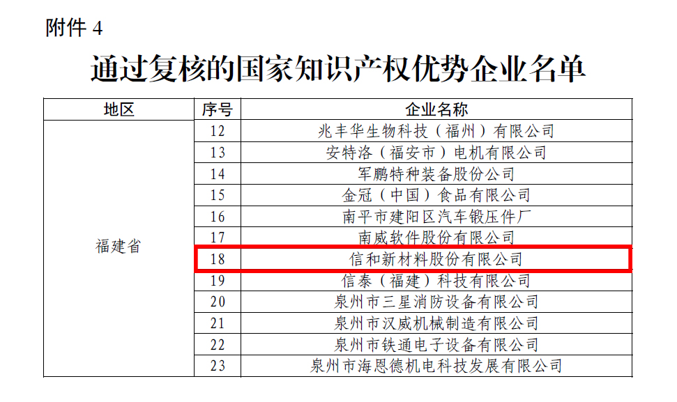 信和于2016年首次通過國家知識產(chǎn)權(quán)優(yōu)勢企業(yè)認(rèn)定,2019年順利通過了一輪復(fù)核認(rèn)定,本次第二輪的復(fù)核認(rèn)定,是政府對信和歷年來在知識產(chǎn)權(quán)領(lǐng)域取得成績的肯定,充分體現(xiàn)了信和良好的科技創(chuàng)新能力和突出的綜合競爭優(yōu)勢,有利于進一步推動公司知識產(chǎn)權(quán)的發(fā)展和管理、不斷增強公司的核心競爭力。