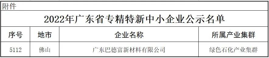 近日,廣東省工業和信息化廳對審核通過的2022年專精特新企業進行了公示,巴德富集團名列其中,榮獲2022年“廣東省專精特新企業”認定。