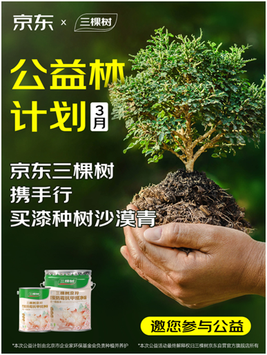 伴隨新品上市,延續三棵樹“健康+自然”的品牌基因,三棵樹與京東聯合啟動"買一漆種一樹":3月活動期間,每新增一位JC乳膠漆系列購買用戶,品牌將在內蒙古阿拉善荒漠化地區種植一棵樹。