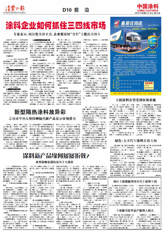 《中國涂料報》(電子版)的一切內容(包括但不限于文字、圖片、PDF、圖表、標志、標識、商標、版面設計、專欄目錄與名稱、內容分類標準以及為讀者提供的任何信息)僅供中國涂料信息網讀者閱讀、學習研究使用,未經中國涂料雜志社有限公司及/或相關權利人書面授權,任何單位及個人不得將《中國涂料報》(電子版)所登載、發布的內容用于商業性目的,包括但不限于轉載、復制、發行、制作光盤、數據庫、觸摸展示等行為方式,或將之在非本站所屬的服務器上作鏡像。否則,中國涂料雜志社有限公司將采取包括但不限于網上公示、向有關部門舉報、訴訟等一切合法手段,追究侵權者的法律責任。